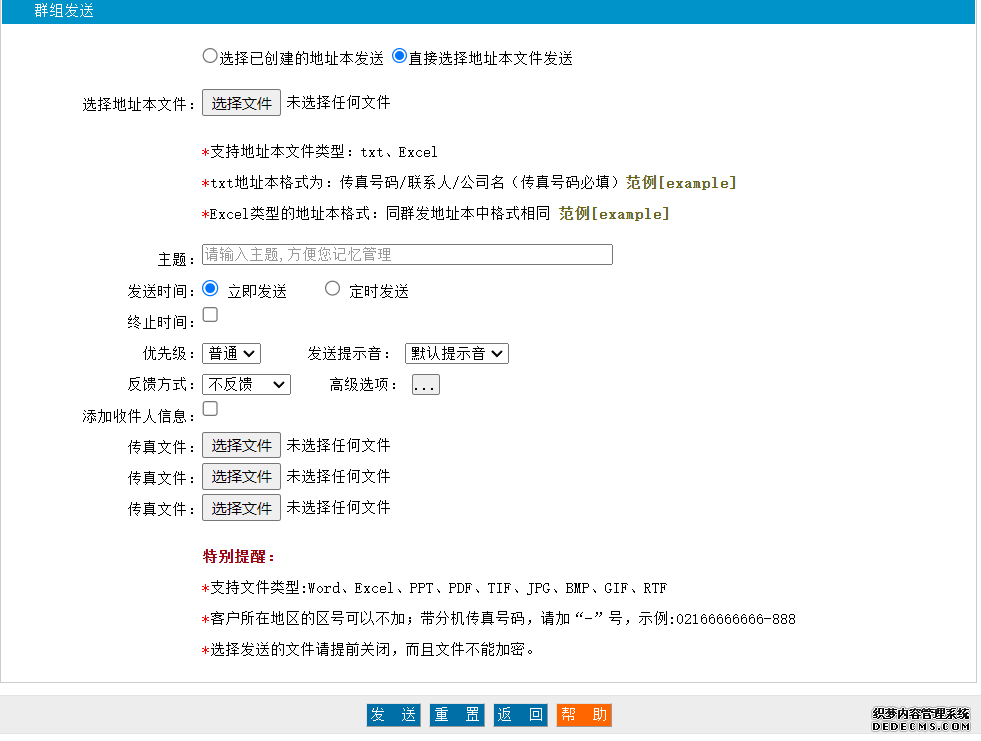 您可以在“地址本管理”中導入傳真號碼,地址本為Excel或TXT文件,格式請參考系統內的“地址本范例”。