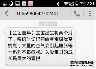 金色童年的知信營銷可以說非常的成功,因為他們針對的是我們這些有孩子的父母,他們知道我們需要什么。所以,他們就以短信的方式一個月左右的時間發一次健康提醒,及需要注意的地方。一個月的時候注意什么,二個月的時候注意什么,他們幾乎每個月都會提醒一次,而不是像有些商家,恨不得一天發幾十條短信。