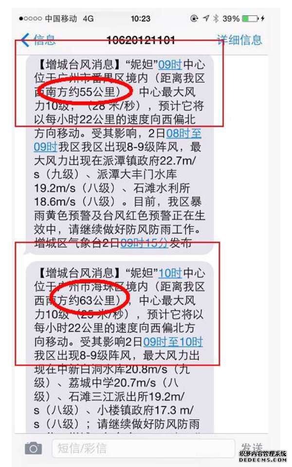 文章標題:短信群發之4號臺風“妮妲”應急短信通知