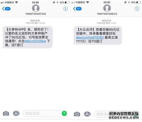 當我們查閱兩條短信內(nèi)容時,會發(fā)現(xiàn),短信要表達的意思大致相同,都是送紅包,但排版的不一樣,導致最后兩條短信內(nèi)容的點擊率存在了差距。所以說,排版時,主要將重要信息放在前面,讓用戶在短信預覽時就能夠迅速的抓住重點,并促使用戶打開短信閱讀詳細內(nèi)容。