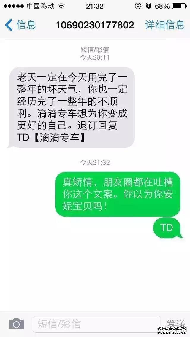 最后,還是滴滴,這條短信有價值的內容其實只是告訴用戶怎么退訂,這是逼用戶退訂的節奏??!