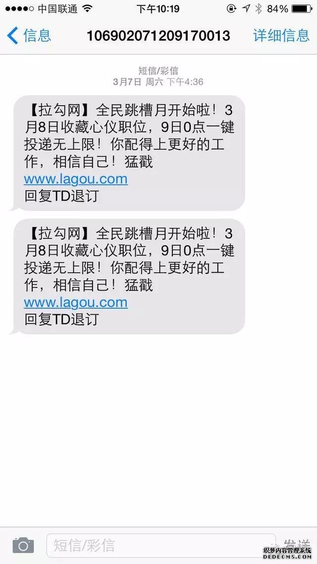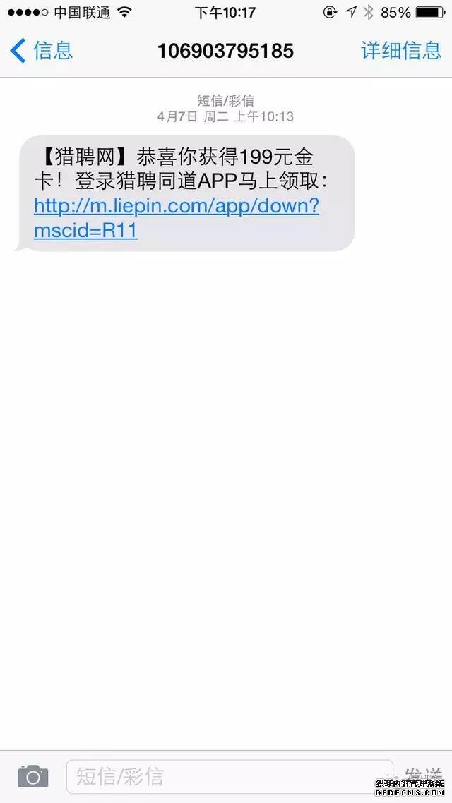 雖然用戶一般都知道獵聘是做招聘的,但你這個獵聘通道是干嘛的?金卡有什么用?用戶收到這條短信的第一感覺是:莫名其妙。還有就是鏈接太長了,短信中都是使用短鏈接。