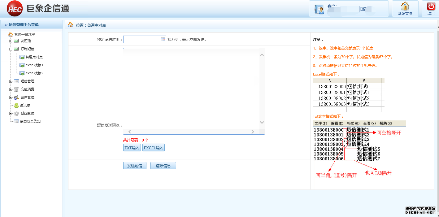 根據該頁面左邊的操作進行發送短信,這里說的主要是是發送短信的時候格式的問題。選擇好導入發送,TXT或者EXCEl導入方式,然后點擊發送短信即可,根據提示操作。