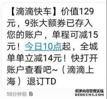 就是這樣的日常營銷短信,滴滴完成了自己的用戶積累,據(jù)統(tǒng)計(jì),滴滴在2018年至少發(fā)出180億條短信,觸達(dá)用戶6億+!