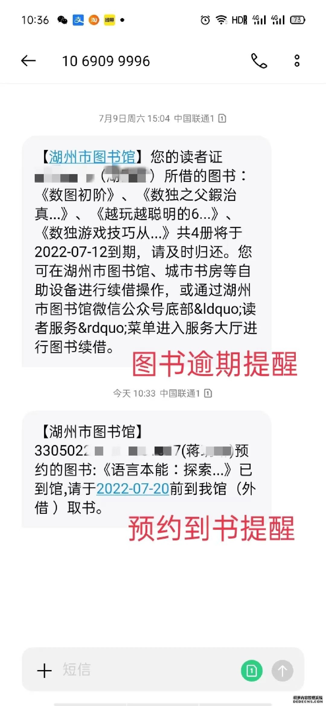 在此,也和大家官宣一下我們上線的暖心服務(wù):通過應(yīng)用短信服務(wù)平臺(tái)提供圖書到期提醒、圖書超期提醒、讀者卡到期提醒、圖書續(xù)借、讀者借閱查詢、讀者證有效期查詢、欠款查詢、書目查詢等短信服務(wù)。