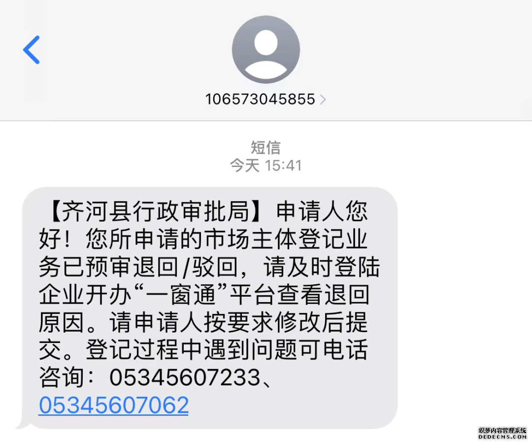 除此之外,如若材料退回需要修改,智能短信數字人也會向申請人發送對應的短信(如下)。