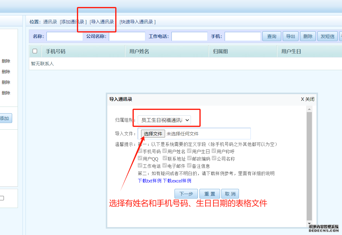 第三步、在平臺界面的通訊錄中建立一個新的通訊組(有手機號碼、姓名、生日日期),操作方法如下所示