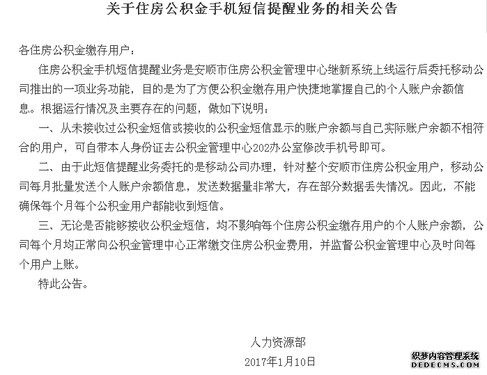 近日安順市發(fā)布了關(guān)于住房公積金手機(jī)短信提醒業(yè)務(wù)的相關(guān)公告,安順市住房公積金管理中心繼新系統(tǒng)上線運(yùn)行,為方便公積金繳存用戶快捷地掌握自己的個人賬戶余額信息新增短信群發(fā)業(yè)務(wù)。使每一個用戶都能及時方便的得知個人住房公積金繳存情況。