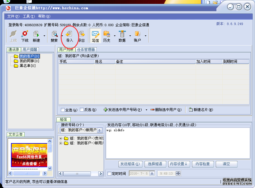 尊敬的巨象企信通用戶您好!感謝您選用巨象企信通,本公司從2004年起經(jīng)營企業(yè)短信業(yè)務(wù),有數(shù)萬老用戶和優(yōu)質(zhì)通道,我們10年如一日,秉承專業(yè),專心,真誠的心為您創(chuàng)造更大的價值。巨象企信通軟件界面友好,操作簡單,功能實用,新用戶2-5分鐘即可熟練操作應(yīng)用。本文主要目地是為了更好的讓您用好企信通,我們特別對以下功能做重點提示,如有不明白的地方也可以致電我們的客服人員,我們將竭誠為您服務(wù)!