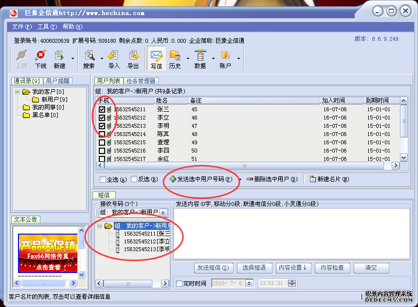 選擇所要發(fā)送號碼的文件夾,在號碼前畫∨再點“發(fā)送選中用戶號碼”所選號碼將出現(xiàn)在接收號碼對話框中。如下圖所示: