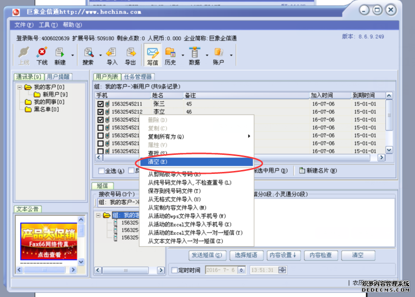 注意:當(dāng)接收號碼框中已有號碼時,如果不想發(fā)送這些號碼,那么在接收號碼框點擊右鍵在彈出的菜單中選擇“清空”號碼就可以。如果不清空,那么信息發(fā)送時這些號碼一樣會發(fā)送。操作如下圖: